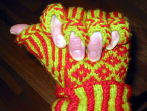 ![]() :: lace pattern :: (interweave knits summer 2000) multiple of 10 stitches worked in the round... ~cast on and work one round of purl pattern round ~ *k3, yo, k1, yo, k3, sl 1, k2tog, psso; rep from * ~ next round ~knit repeat these 2 rounds ...with this trick... before starting each pattern round - slip the first stitch ![]() ~::~ 2 color braid ~::~ row one:: place yarn used for stitch over yarn used for previous stitch row two:: place yarn used for stitch under yarn used for previous stitch
